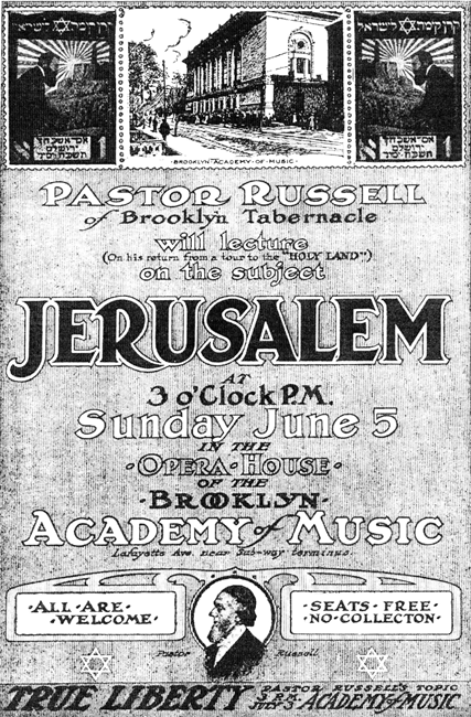 Wykład ten był od dawna zapowiadany i wiele tysięcy kopii People’s Pulpit (zobacz poniżej fragment ostatniej strony tej ulotki) zostało rozdanych przez wiernych ochotników. Naturalnie temat oraz fakt, że Pastor Russell wrócił właśnie z podróży do Palestyny i Jerozolimy wznieciły wielkie zainteresowanie wśród Żydów i wielu ich znalazło się w Akademii, by słuchać kazania, podczas gdy liczni czekali na zewnątrz, mając nadzieję, że część tych ze środka wyjdzie, a wtedy oni będą mogli zająć ich miejsca. Czekali jednak daremnie, gdyż ci wewnątrz byli zbytnio zainteresowani, aby wyjść. Zamieszczamy część tego kazania, jak następuje: