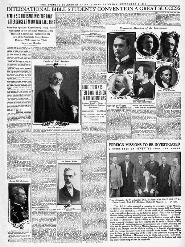 Pierwsza strona relacji prasowej The Evening Telegraph, (Philadelphia, 9 września 1911) z konwencji generalnej Badaczy Pisma Świętego w Mount Lake Park, MD w dniach 1-11 września 1911 r. Opatrzono ją nagłówkiem: „Wielki sukces Międzynarodowej Konwencji Badaczy Pisma Świętego. Blisko sześć tysięcy uczestników codziennych spotkań w Mountain Lake Park. Czterdziestu czterech mówców reprezentujących wiele krajów przemawiało na dziesięciodniowym spotkaniu w Maryland Chautauqua”. Zamieszone zostały także: początkowe wystąpienie gen. W.P. Halla, zdjęcia wyróżniających się mówców, informacja o wyborach oraz zapowiedź misyjnej podróży dookoła świata w siedmioosobowym składzie: E.W.V. Kuen, L.W. Jonse, P. Hall, C.T. Russell, F.H. Robinson, R.B. Maxwell, J.T.D. Pyles. Fragment artykułu: „Dziesięciodniowe spotkanie Badaczy Pisma Świętego w górach” publikujemy obok.