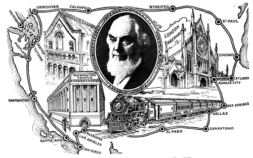 Trasa podróży: Chicago, St. Louis, (Kansas City), Hot Springs (konwencja), Dallas, San Antonio, El Paso, Tuckson, Los Angeles, San Diego, Santa Anna, Pasadena, San Francisco, Portland, Tacoma, Seattle, Victoria, Vancouver, Calgary, Edmonton, Regina, Brandon, Winnipeg, Minneapolis, St. Paul.