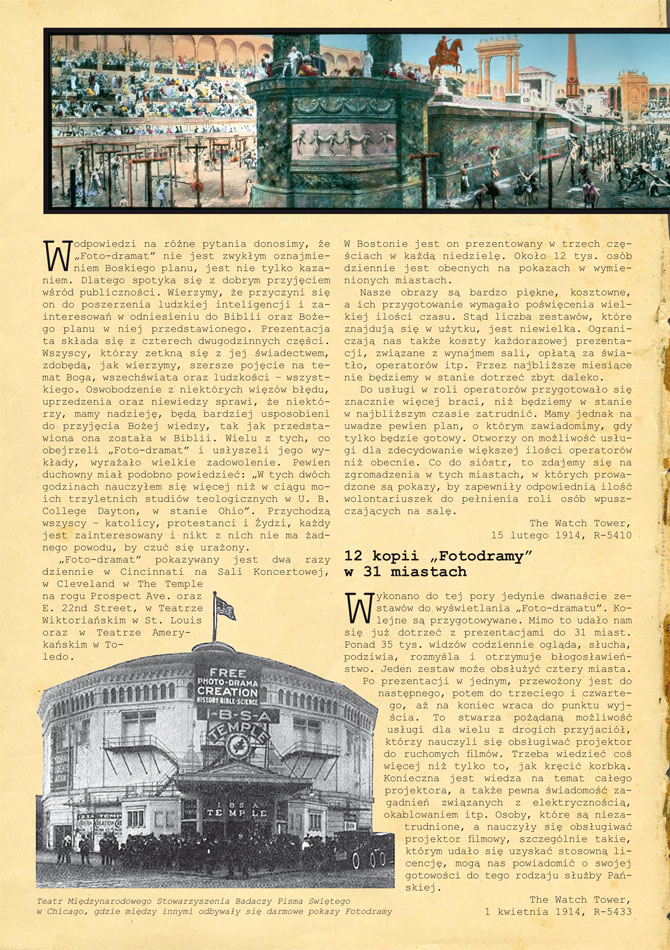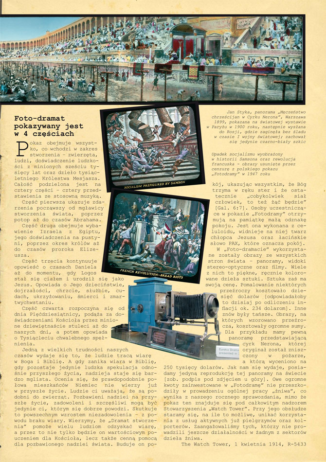 W „Foto-dramacie” wykorzystane zostały obrazy ze wszystkich stron świata – panoramy, widoki stereo-optyczne oraz filmy. Wiele z nich to piękne, ręcznie kolorowane dzieła sztuki. Sztuka zaś ma swoją cenę. Pomalowanie niektórych przeźroczy kosztowało dziesięć dolarów [odpowiadałoby to dzisiaj po odliczeniu inflacji ok. 234 dolarom]. Inne znów były tańsze. Obrazy, na których wzorowano przeźrocza, kosztowały ogromne sumy. Dla przykładu mamy pewną panoramę przedstawiającą cyrk Nerona, której oryginał został zniszczony w pożarze, a którą wyceniono na 250 tysięcy dolarów. Jak nam się wydaje, posiadamy jedyną reprodukcję tej panoramy na świecie [zob. podpis pod zdjęciem u góry]. Owe ogromne kwoty zainwestowane w „Fotodramę” nie przeszkodziły w prowadzeniu ogólnej pracy „żniwa”, co wynika z naszego rocznego sprawozdania, mimo że pokaz ten znajduje się pod całkowitym nadzorem Stowarzyszenia „Watch Tower”. Przy jego obsłudze staramy się, na ile to możliwe, unikać korzystania z usług aktywnych już pielgrzymów oraz kolporterów. Zaangażowaliśmy tych, którzy nie prowadzili jeszcze działalności w żadnym z sektorów dzieła żniwa.