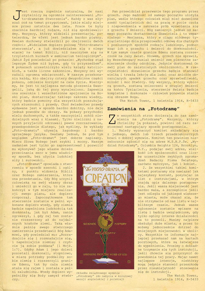 Jest rzeczą zupełnie naturalną, że nasi czytelnicy są ogromnie zainteresowani „Foto-dramatem Stworzenia”. Każdy z was słyszał coś na temat przygotowań, jakie miały miejsce przez ostatnie dwa lata. Prace te były znacznie bardziej nużące, niż się spodziewaliśmy. Wszyscy, którzy widzieli prezentację, potwierdzą, że efekt jest jednak bardzo piękny. Pewien duchowny stwierdził po obejrzeniu dwóch części: „Widziałem dopiero połowę ‘Foto-dramatu stworzenia’, a już dowiedziałem się z niego więcej na temat Biblii, niż nauczyłem się na trzyletnich kursach w seminarium teologicznym”. Jakiś Żyd powiedział po pokazie: „Wychodzę stąd lepszym Żydem niż byłem, gdy tu przyszedłem”. W pokazach uczestniczyło wielu księży katolickich, a także liczne zakonnice. Wszyscy oni wyrażali ogromną wdzięczność. W naszym przekonaniu każdy, kto obejrzy cztery dwugodzinne części pokazu, odniesie korzyść na całe życie. Wierzymy, że jest to najlepsza metoda głoszenia Ewangelii, jaką do tej pory wynaleziono. Zapewnia ona szerokie i wszechstronne spojrzenie na Boski plan, dostarczając takiego zakresu wiedzy, który będzie pomocny dla wszystkich poszukujących słuszności i prawdy. Choć świadectwo prawdy wydawane jest w sposób bardzo dobitny, nie daje jednak powodów do obrazy. Na pokazy przychodzi wielu duchownych, a także nauczycieli szkół niedzielnych wraz z klasami. Tylko nieliczni z naszych przyjaciół odczuwali pewne rozczarowanie, prawdopodobnie dlatego, jak myślimy, że wykłady „Foto-dramatu” używają łagodnego i bardzo uprzejmego języka. Uważamy jednak, że pod tym względem „Foto-dramat” jest dobrze napisany. Miecz Słowa Bożego jest szybki i mocny. Naszym zadaniem jest tylko go zaprezentować i pozwolić mu wykonywać jego własne dzieło przecinania serc w jemu właściwy sposób, bez użycia ludzkiej siły i surowości.