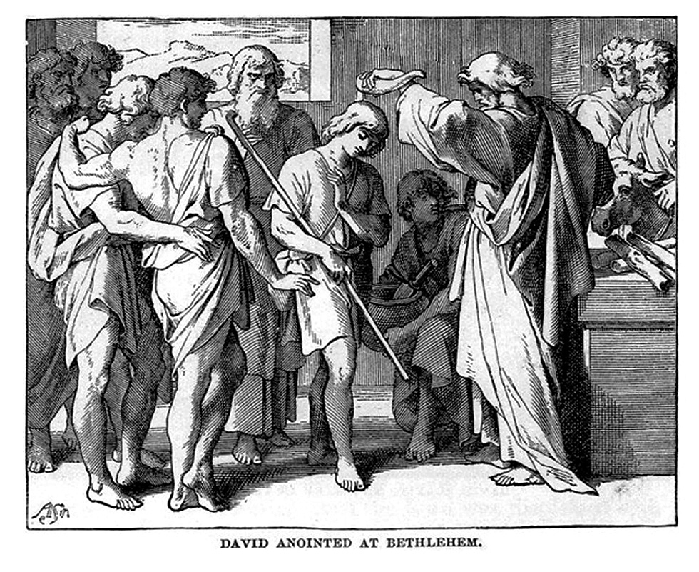 Posłany, aby pomazać Dawida, prorok Samuel okazał strach, który nie ujawniał się u niego w innych sytuacjach. Nie wahał się wykonać Pańskiego polecenia, ale dał do zrozumienia, że wyraźnie pojmuje, iż będzie to oznaczało narażanie swego własnego życia – że król Saul zabije go jako zdrajcę, jeśli namaści królewskiego następcę. Pan wyjaśnił z kolei, że nie jest Jego zamiarem ujawnianie od razu tej sprawy, i skierował go do Betlejem oraz nakazał złożenie tam ofiary i przy okazji odnalezienie i namaszczenie tego, który w stosownym czasie zasłynie i zostanie wyniesiony na tron. W tym momencie prorok miał jedynie wykonać początkowe dzieło, którego nie zrozumieli ojciec i bracia Dawida, myśląc może, że owo pomazanie oznaczało specjalne błogosławieństwo albo też Pańskie mianowanie na członka szkoły proroków lub coś w tym rodzaju. Możliwe jednak, że w rozmowie prywatnej prorok poinformował Dawida o znaczeniu tegoż namaszczenia, tak jak na osobności powiadomił Saula, gdy potajemnie pomazał go na króla Izraela.