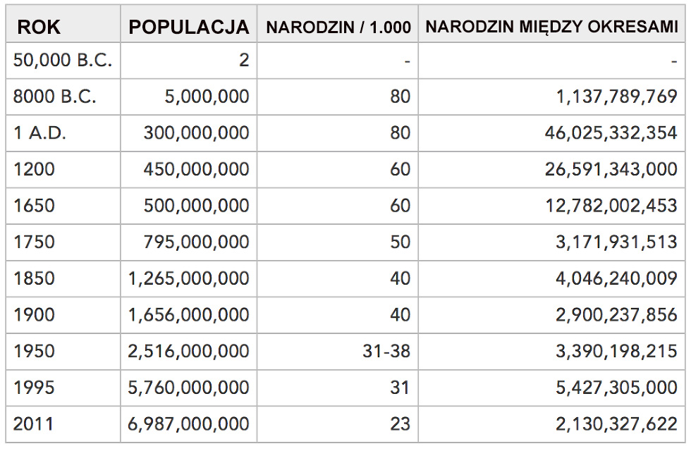 Według szacunków instytutu demograficznego Population Reference Bureau, do r. 2015 urodziło się na ziemi 108,2 mld ludzi. Skoro w 2015 r. żyło na świecie około 7,4 mld ludzi, to około 100,8 mld umarło wcześniej. Stwierdzono także, że średnia liczba urodzeń na tysiąc osób regularnie się zmniejsza. O ile przed naszą erą wynosiła ona 80 dzieci rocznie na tysiąc osób i do początku XX w., czyli na przestrzeni 1900 lat zmniejszyła się o połowę, to kolejne zredukowanie tej liczby o połowę wymagało już tylko nieco ponad jednego wieku. Ocenia się, że w krajach OECD [Organizacja Współpracy Gospodarczej i Rozwoju] liczba ludności zaczęłaby się już zmniejszać, gdyby nie napływ ludności z innych kultur. Jednak i w obrębie tej nowej populacji w ciągu krótkiego czasu liczba urodzeń zmniejsza się i zbliża do przeciętnej otoczenia.